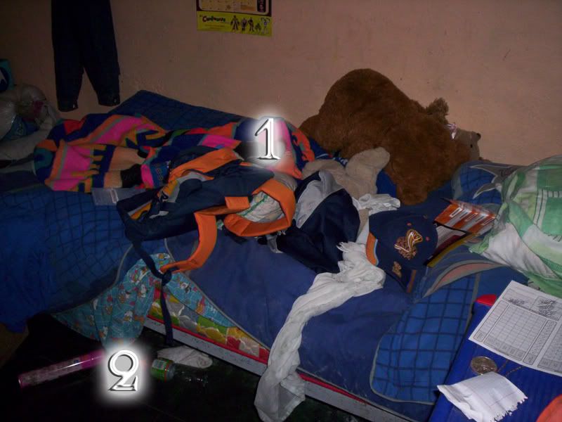 - La parte de arriba: Ahi esta, mi colcha, mi mochila (la de repuesto), mi osote de pelushe, ropa, mi gorra, mis cupones de descuento, y si vieran en este momento, esta el Crookhanks durmiendo, a por cierto ahi estan los boletos para el concierto de Ricardo Arjona en el auditorio Nacional.